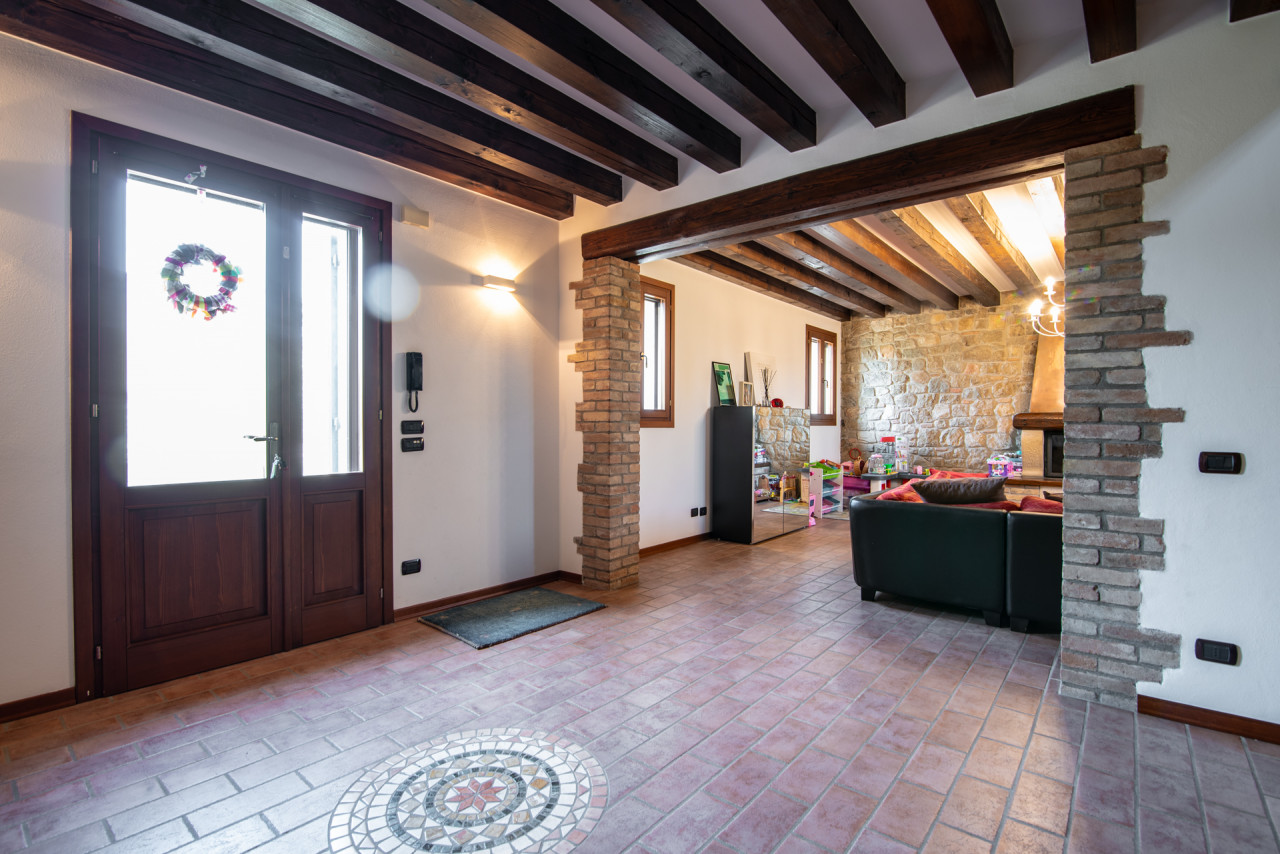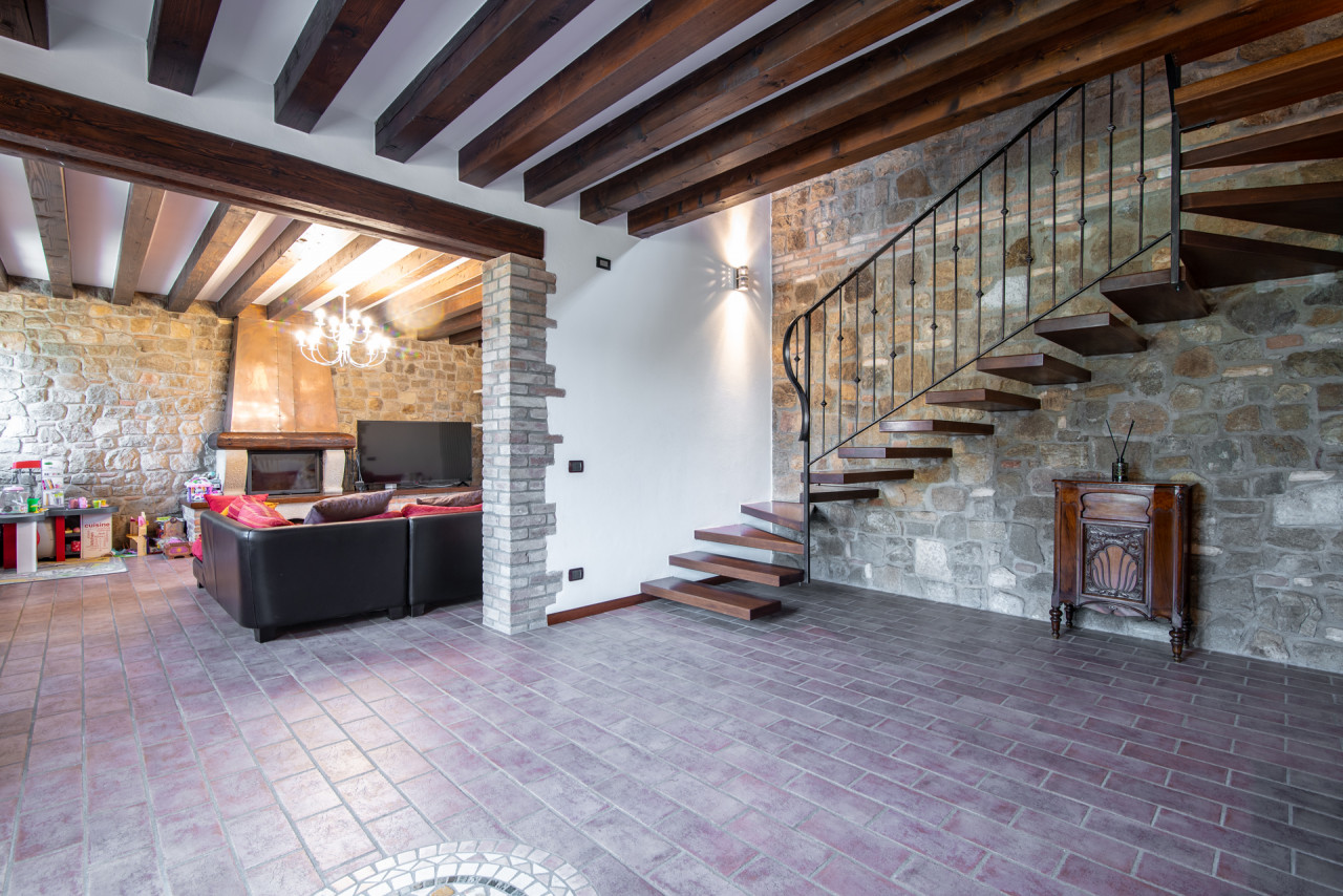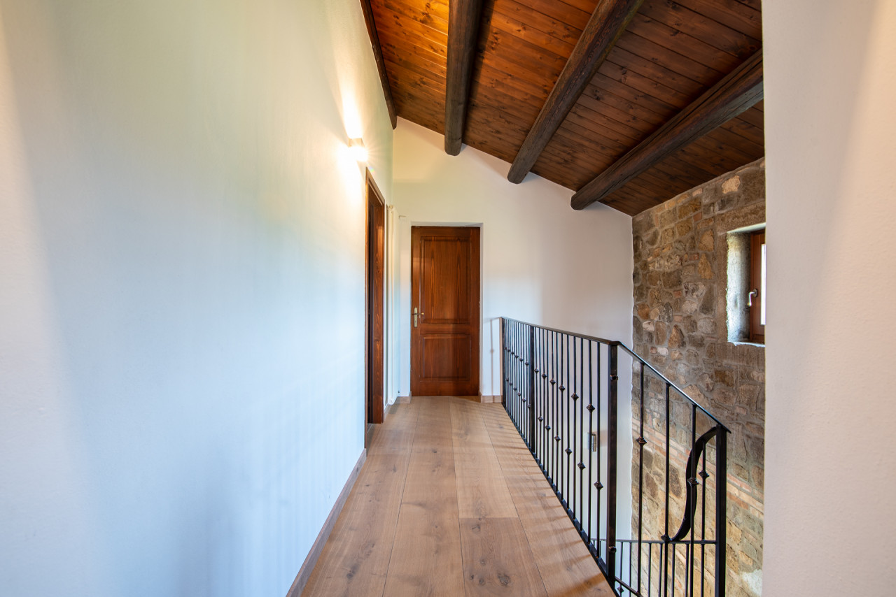 Gli interni conservano il carattere autentico dell’edificio originale: travi in legno a vista, pareti in pietra naturale e dettagli architettonici che raccontano la storia della dimora. L’ampia zona giorno è impreziosita da un camino, elemento centrale che dona calore e atmosfera all’ambiente, mentre la cucina, funzionale e ben collegata, rappresenta uno spazio ideale per la convivialità quotidiana.