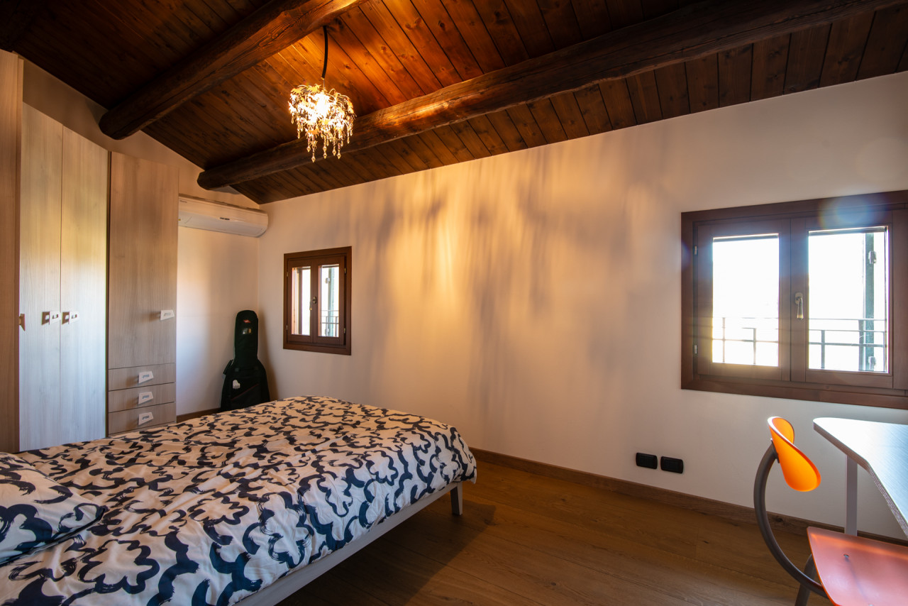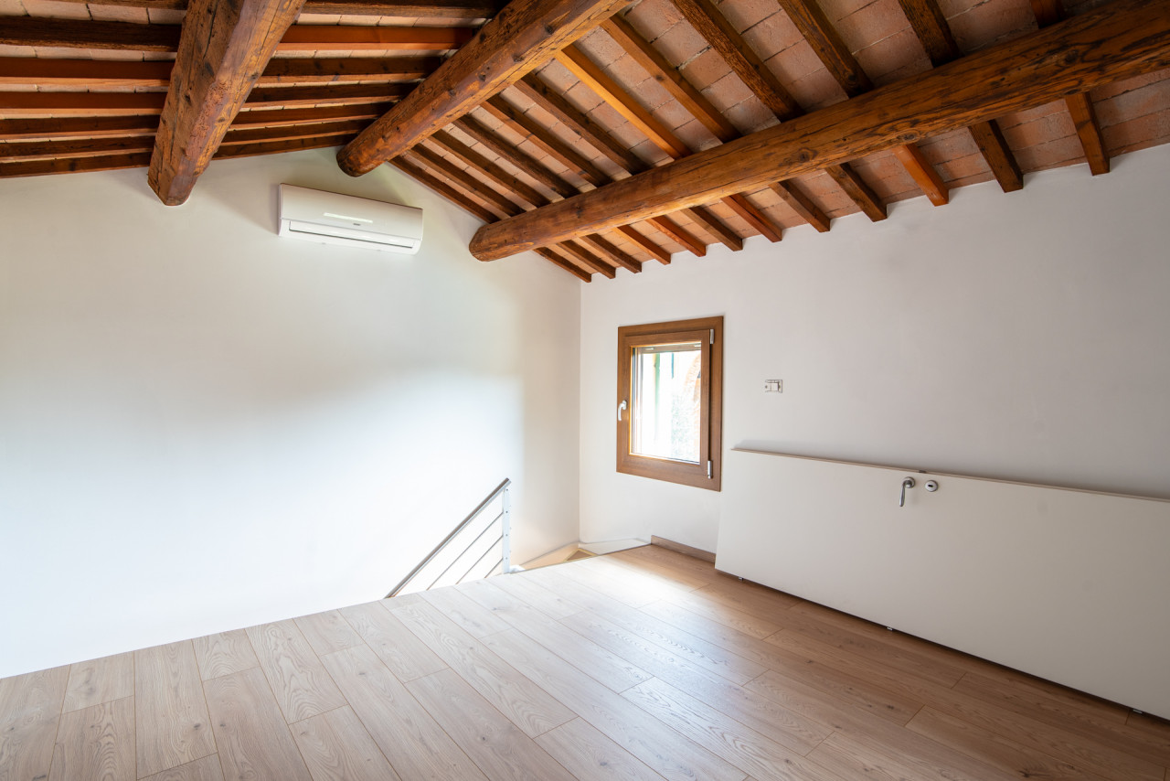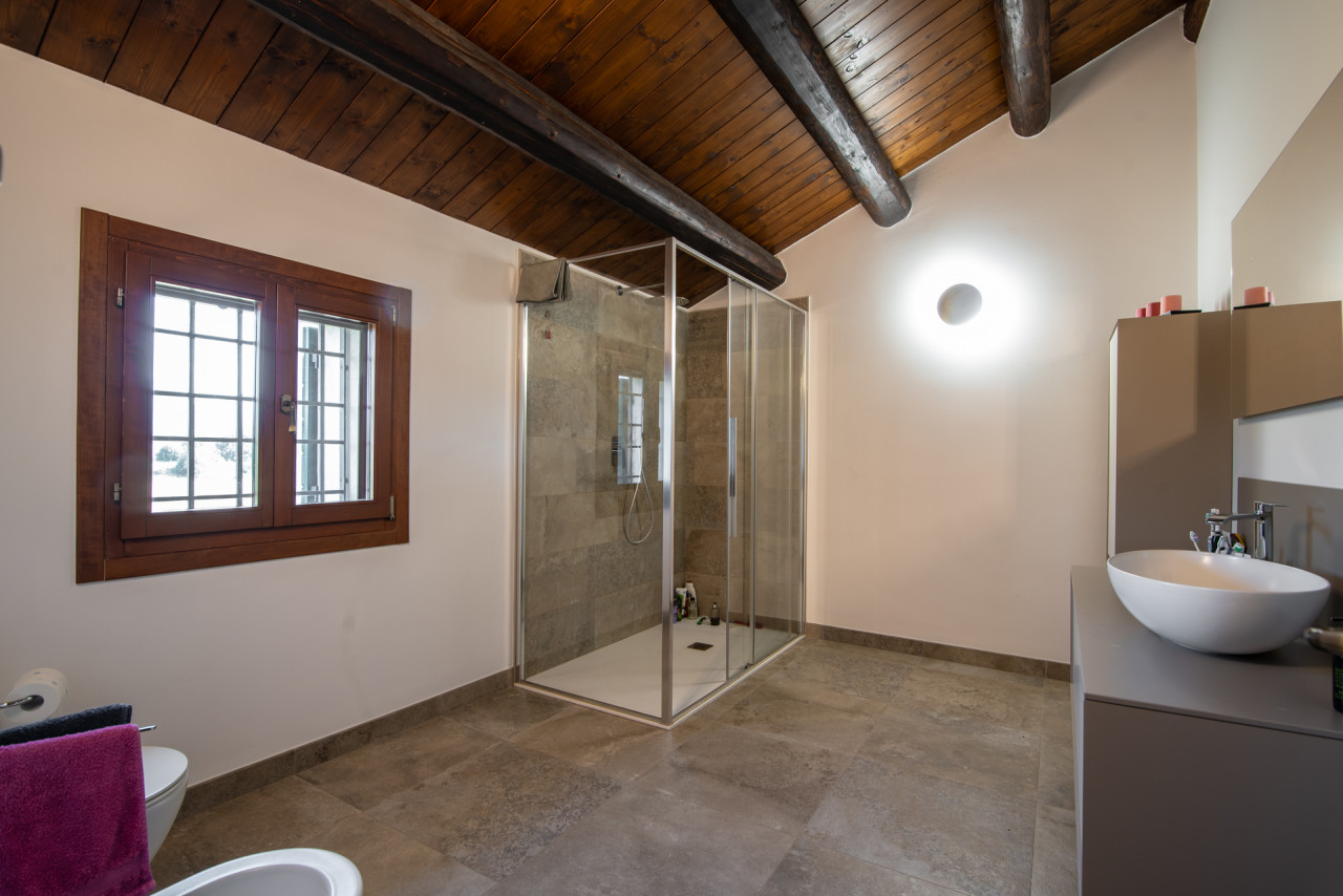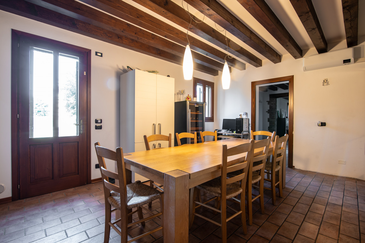 Gli interni conservano il carattere autentico dell’edificio originale: travi in legno a vista, pareti in pietra naturale e dettagli architettonici che raccontano la storia della dimora. L’ampia zona giorno è impreziosita da un camino, elemento centrale che dona calore e atmosfera all’ambiente, mentre la cucina, funzionale e ben collegata, rappresenta uno spazio ideale per la convivialità quotidiana.