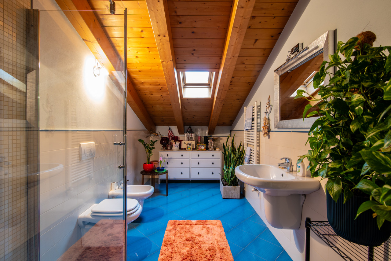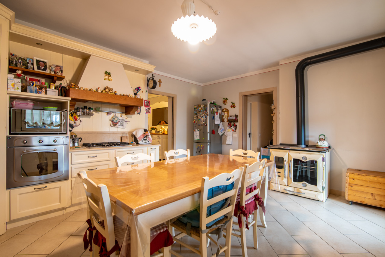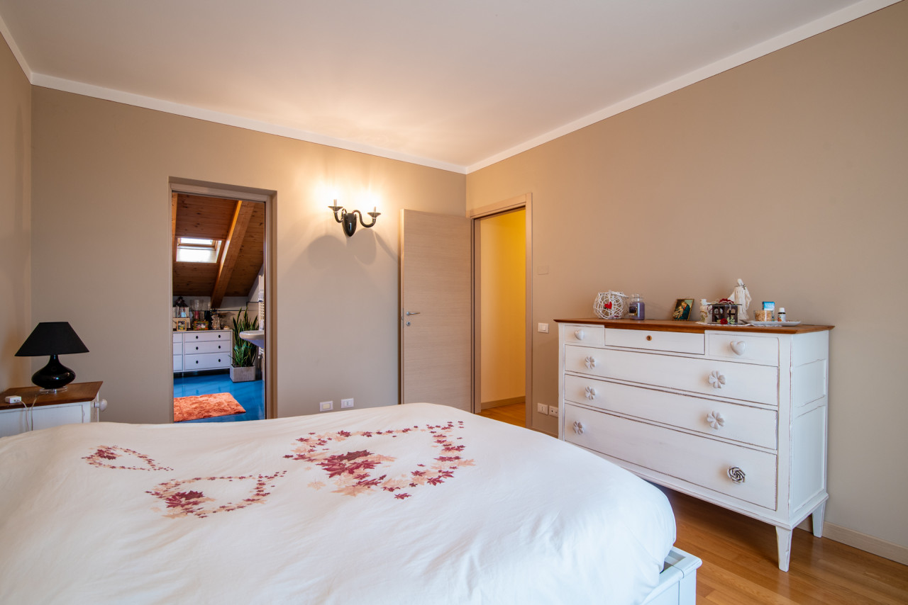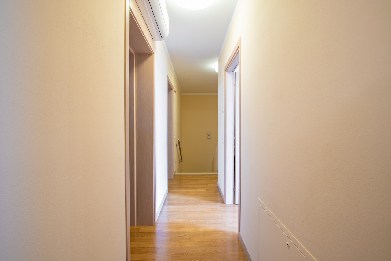 La zona notte, situata al piano superiore, ospita quattro camere da letto, di cui due con accesso al poggiolo, e due bagni finestrati, garantendo comfort e praticità per tutta la famiglia.