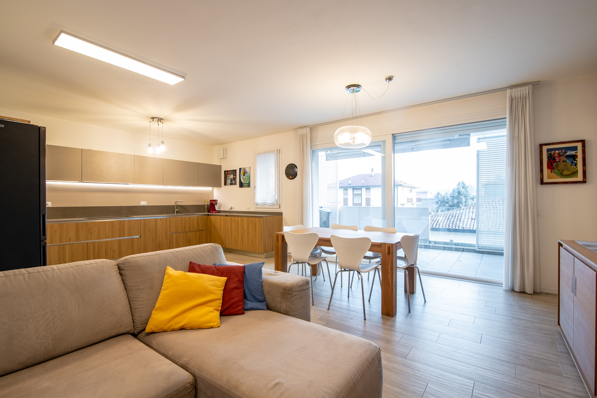 L’appartamento si trova al secondo ed ultimo piano e gode di un’ottima esposizione a sud-ovest che garantisce luminosità naturale per gran parte della giornata. L’ingresso si apre su un ampio soggiorno con zona cottura, un ambiente accogliente e ben distribuito che, grazie a una grande portafinestra, permette l’accesso diretto al terrazzo abitabile, perfetto per pranzi e momenti di relax all’aperto.